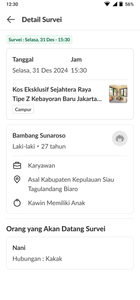 Tergantung dengan kelengkapan data calon penyewa yang mengajukan survei, Anda dapat melihat data berikut: