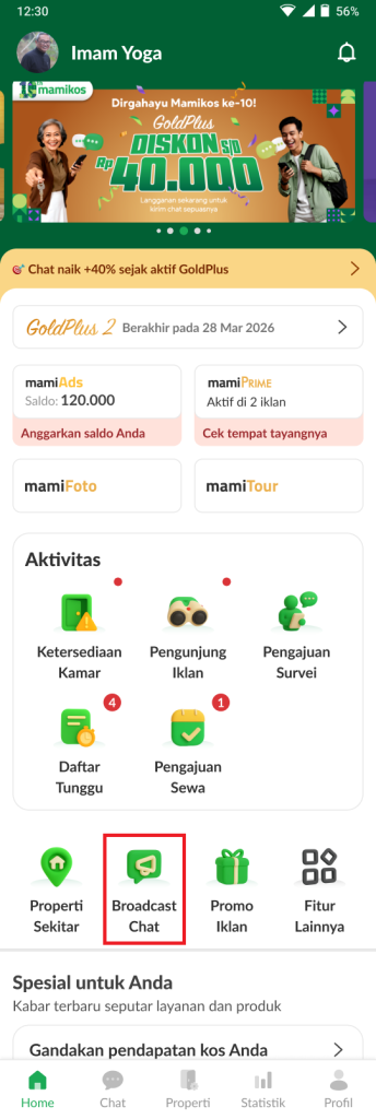 - Login sebagai Pemilik. Lalu di halaman utama aplikasi, klik Broadcast Chat.